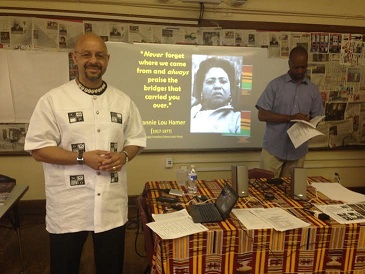 Akua harped to the teachers that the students must have a sense ancestral history and proceeded to showed the history of African people with pictures from his trips to Kemet (Egypt.)
