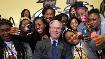 I am confused. Why are these young ladies huddled up under “Dubya” like he is their Messiah? I guess their parents didn’t teach them about this former President’s actions toward their people in their time of need….or how he somehow managed to authorize aid and supplies rather quickly when that tsunami hit Asia (which is a region half way around the world)…Black people WHY???…