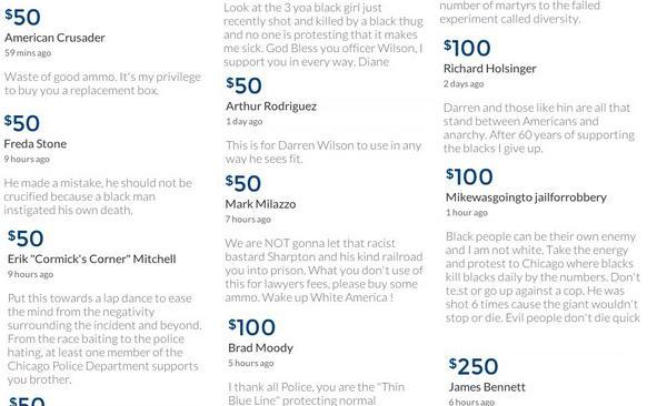 The comments and support from the Darren Wilson GoFundMe page became so blatantly racists,the site administrators had to take the comment section down. Before they removed the comments,there were some screen shots saved and circulated around the net.