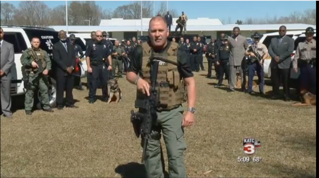 “You will be hunted. You will be tracked. And if you raise your weapon to a man like me, we’ll return fire with superior power,” St. Landry Parish Capt. Clay Higgins says in the Crimstoppers video while wearing an armored vest, holding an assault rifle and standing in front of several dozen race soldiers acting as law enforcement officials. Higgins also used dehumanizing code words for Black people like “thugs” (which is the new N-Word), “animals”, and “heathens”. You will rarely, if ever hear the media or law enforcement use these type of terms against white suspects no matter how heinous their crimes are.